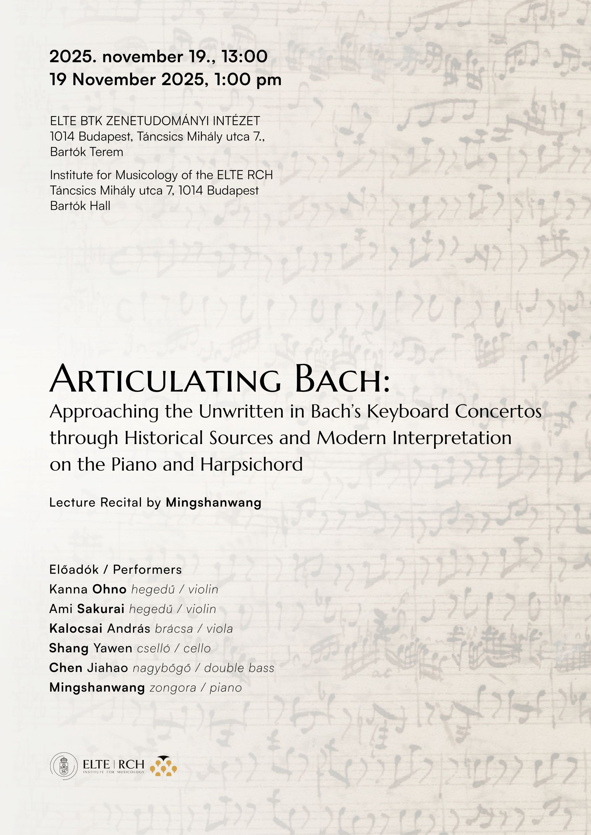 Mingshanwang: Articulating Bach: Approaching the Unwritten in Bach’s Keyboard Concertos through Historical Sources and Modern Interpretation on the Piano and Harpsichord – Lecture Recital ELTE HTK Zenetudományi Intézet, Bartók terem, 2025. november 19. csütörtök, 13 óra 1014 Budapest, Táncsics Mihály utca 7. |