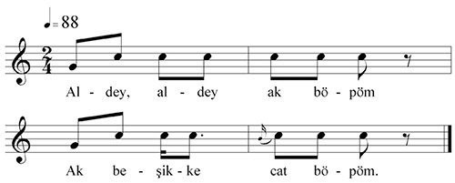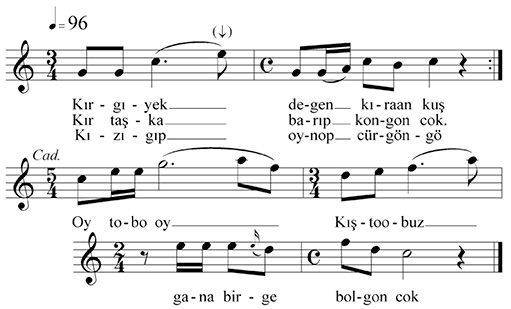 The simplest tunes of Kyrgyz folk music include the epic songs (e.g. the tunes of the Manas epic), lullabies, swinging tunes (selkinçek) and some instrumental tunes. The most elementary ones keep hopping on the G,-C-(D) chord to produce twin-bar tunes of G,-G,-C-C | D-C C scheme (ex.1a, №1-2). Often they acquire a lengthier closing formula (cadenza) of free rhythm (ex.1b, №3). The G,-C interval can be heard in lots of pentatonic and pentatony-based music, but as will be seen later, the lines of the laments of Kyrgyz folk music, which is basically non-pentatonic, also often begin and/or end with this interval.