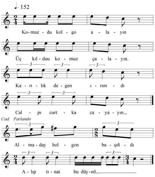 Descending and convex lines being frequent in the music of other Turkic groups, too, their ocurrence in many Kyrgyz twin-bar melodies is not surprising. The most frequent lines descend or outline a hill on the notes (G)-E-D-C-G, or C-D-E-(G)-E-D-C/G, respectively (Ex.7, №34-40). Such twin-bar tunes often occur in many folk musics, including Turkic musics, and constitute significant tune groups as they do in Kyrgyz folk music, too.