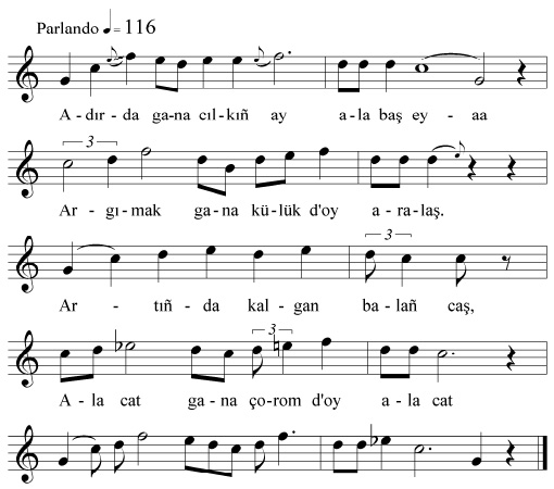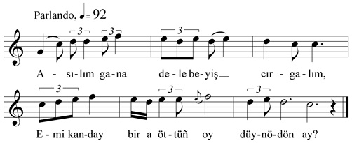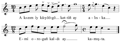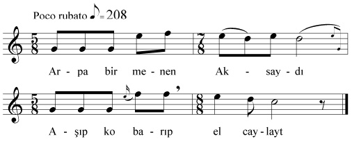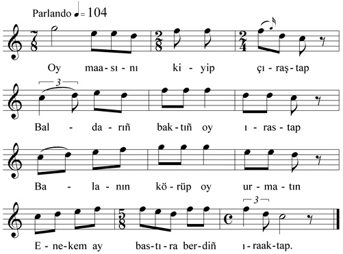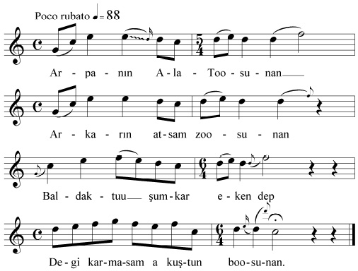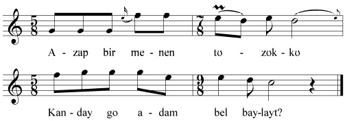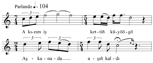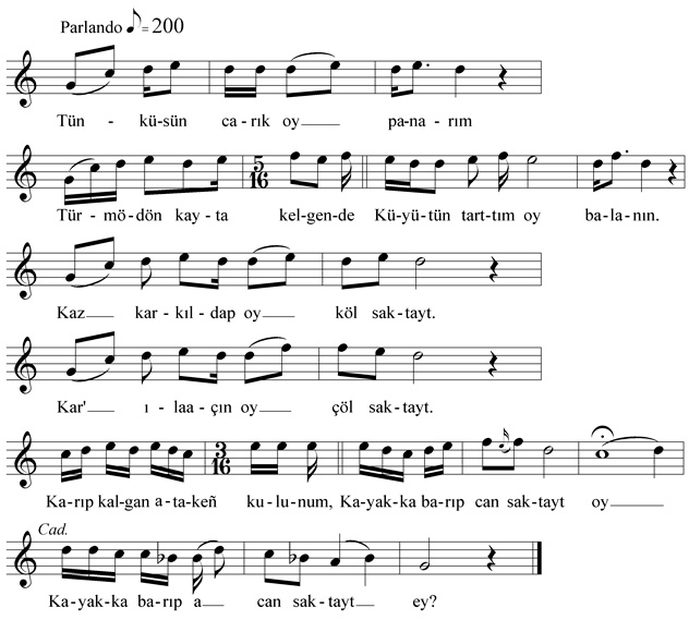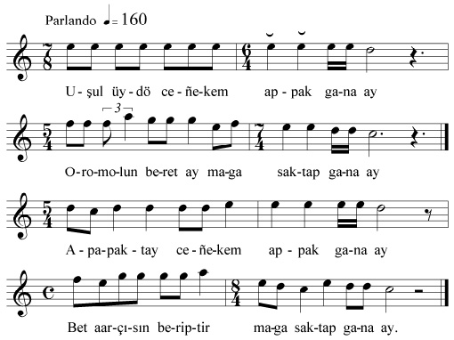 There is a large and significant group of Kyrgyz folk music the tunes of which display kinship with the above outlined two-core laments by virtue of their melodic line, main cadences and free improvisatory performing character. Some are performed poco rubato, but the giusto performance can also be heard. Their lines are shorter than the lament lines and many tunes are isometric or quasi-isometric. Certain segments of the melody outline in some of them also deviate from the customary turns in laments.