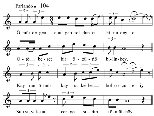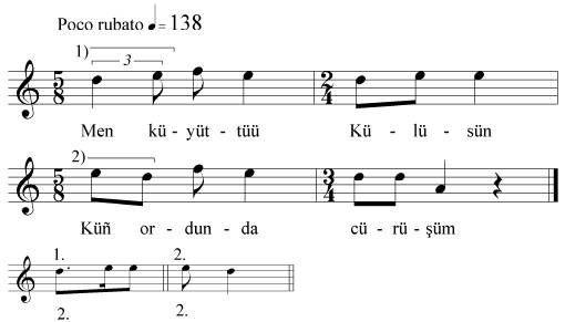 3.2.2. Giusto tunes with shorter lines and (4) or (5) main cadence (ex.29a-b, №198-204). In the majority of these songs the first line and the beginning of the second recite on the D-F/G’, only the end of line 2 jumping down to A. This alludes to an old Kyrgyz melody form, for these tunes are thus also related to the salient Major-character tunes with (4) cadence. Examples of tunes with (4) cadence are ex.29a and №198-200, those with (5) cadence are ex.29b and №201-203.
