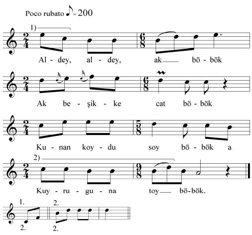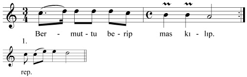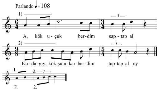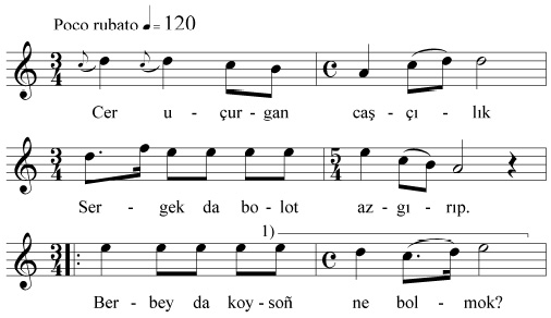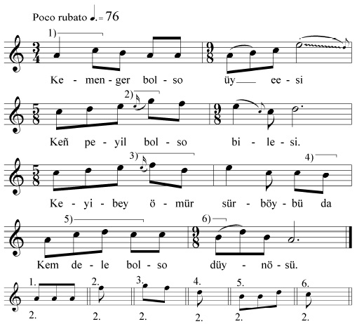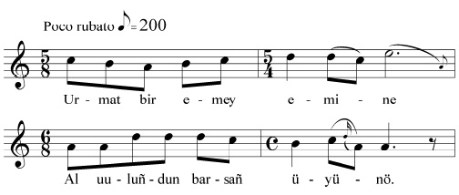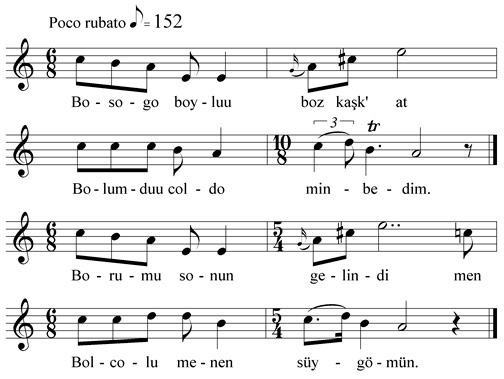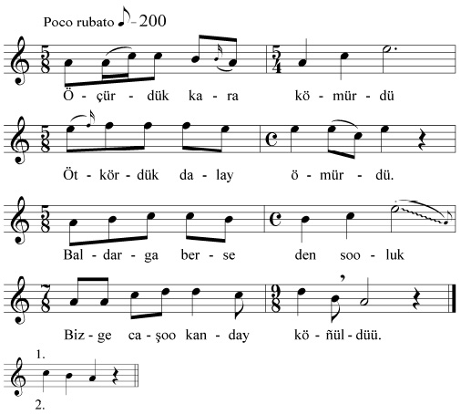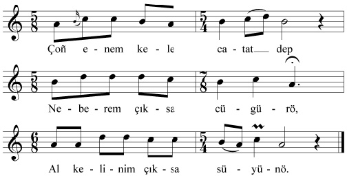 The typical melody contour of the lines of non-motivic Kyrgyz tunes are hill-shaped or descending. In addition, mainly in twin-bar tunes and some lines of other songs, hopping or rotating motion may also occur. The first line of the tunes in this class traces a valley or undulates, touching on the key note in mid-line. This feature marks them off from the rest of the Kyrgyz tunes and justifies their separate treatment.