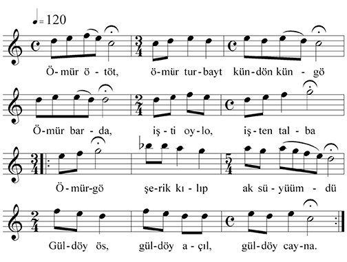 The cadential sequence of the four tunes belonging here is b3 (7) 4/5/7, and their melody outlines also display features deviating from traditional Kyrgyz tunes (ex.43, №330-332).