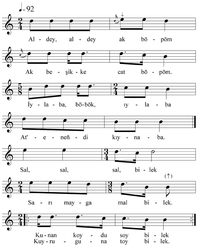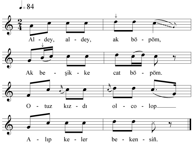 Lullaby (Beşik ırı), Otorbek kızı Azimkan (1949, Köpürö Bazar), Kuşçu, Taldı-Bulak, 2004