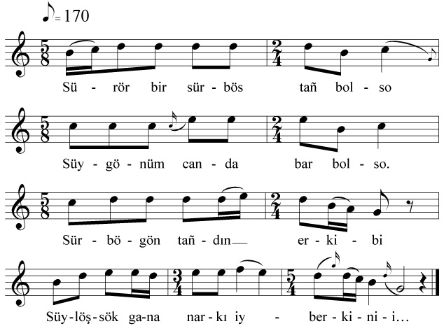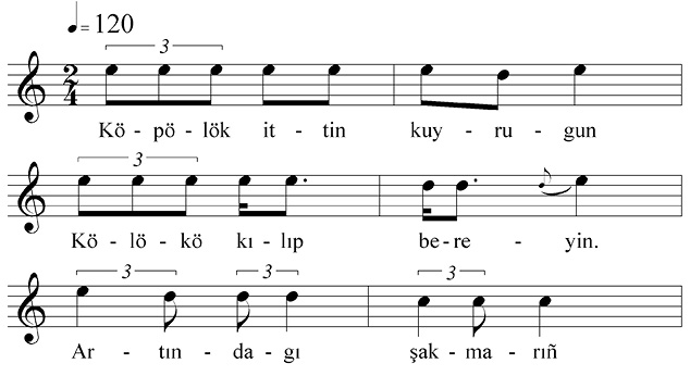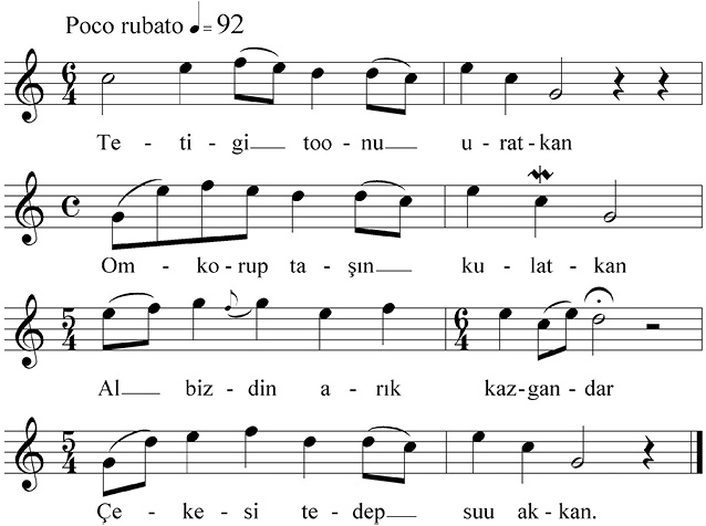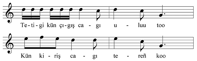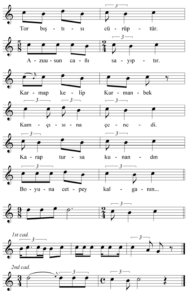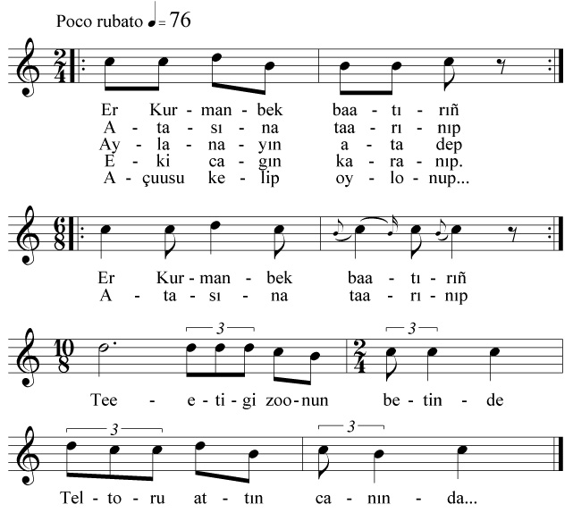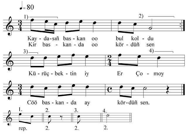 Fragment from the epic Kürüçbek (Kürüçbek’s son Er Çomoy), Süyörkul İsmankulov (1937, Kara-Kol), Cetigen, Talas, 2004
