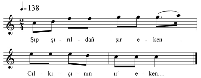 Merry dance song sung on the eve of the bride’s farewell, Abdıldayev Şükür (1933, Barskoon), Buğu-Bapa, Barskoon, yayla, 2002